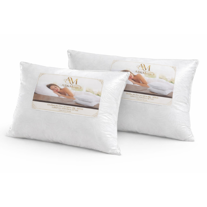 – Oreillers premium All&More – qualité hôtel 5★ – Lot de 2 oreillers – format 70 x 50 cm – Tissu doux 100% Coton avec zip, respirant et hypoallergénique – Garnissage fibres siliconées pour un confort optimal – Soutien moelleux adapté à toutes les positions – Résistants, durables et lavables en machine – Idéal pour des nuits paisibles et réparatrices
