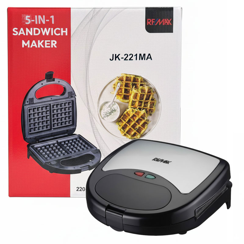 Appareil de Cuisson 5en1 REMAX JK-221MA - Puissance: 750 Watts - Pour Panini, Gaufre, Zouza, Maamoul.. - Plaques amovibles antiadhésives facile à nettoyer - Témoin lumineux - Poignée isolante - stockage en position verticale - Patins anti-dérapants - Boitier résistant à la chaleur - Couleur: Noir - Garantie: 1an Livraison Gratuite à partir de 300DT d'Achat