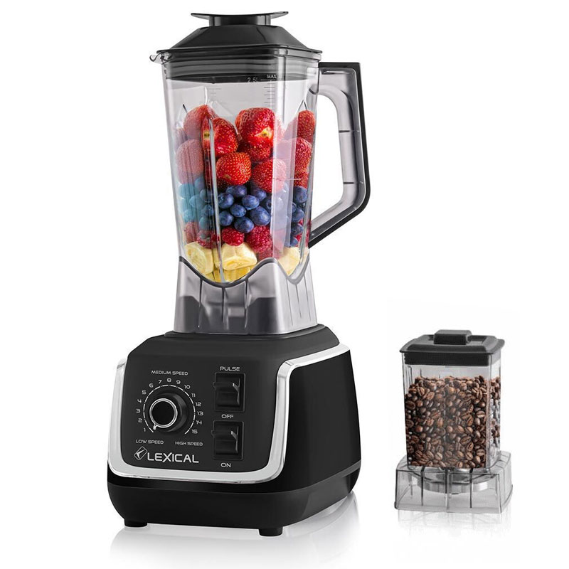 Blender 2EN1 LEXICAL - Puissance: 1500 Watts - Capacité: 2 Litres - Lames en acier inoxydable de haute qualité - Nombre de vitesse: 15 Vitesses + Fonction pulse - Usage quotidien simplifié grâce à sa légèreté et sa maniabilité - Nettoyage facile - Pieds antidérapants - Facile à utiliser - Accessoires Moulin à café - Couleur: Noir - Garantie: 1an Livraison Gratuite à partir de 300DT d'Achat