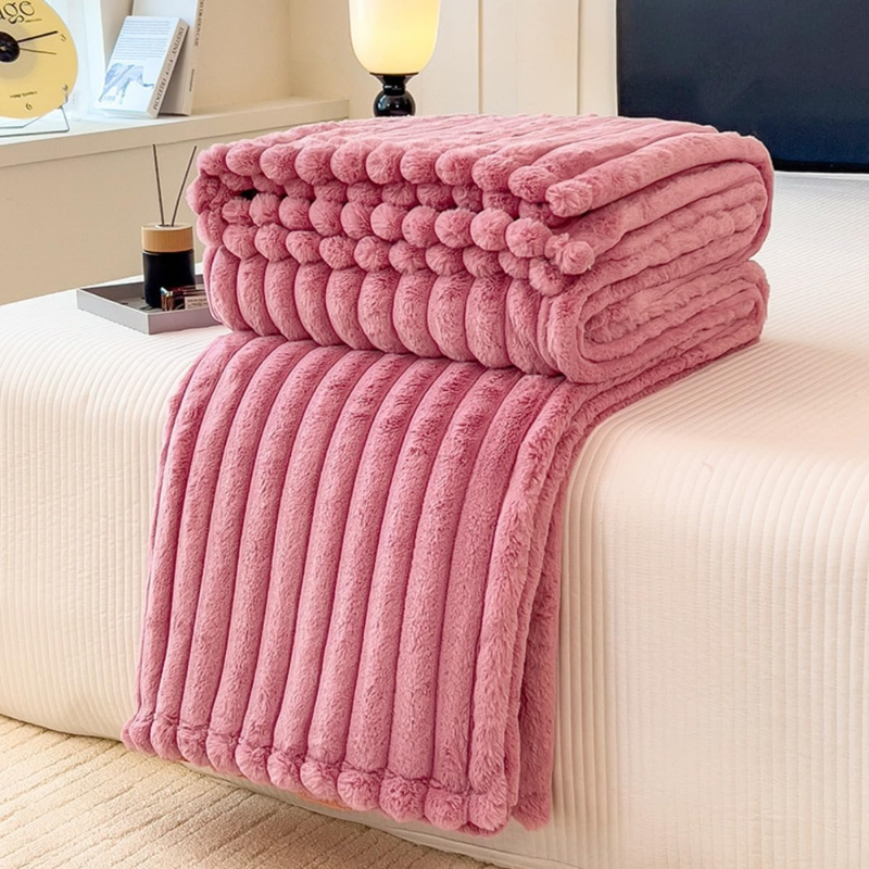 CASA NOVA – Couverture en Flanelle douce et chaude 2 places à Rayures 3 pièces Rose
