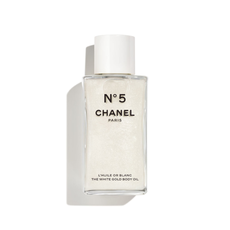 N°5 L’Huile Corps Or Blanc est une huile scintillante qui sublime la peau et éveille les sens. Son flacon à la simplicité radicale renferme des particules nacrées aux nuances d’or blanc. Sa formule voluptueuse offre à la peau la douceur d’un voile de satin et la signature sensuelle du N°5.