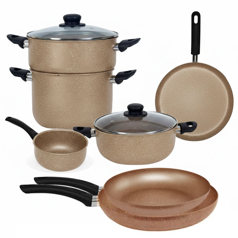 Pack El Gusto By COOK'ART - Nombre de pièce: 9 Pièces - Couscoussier 6 Litres + 2 x Faitouts 24cm + Poêle 24cm + Poêle 26cm + Crepiere 25cm + Casserole 18cm - Matière: Granite - Couleur: Marron Livraison Gratuite à partir de 300DT d'Achat