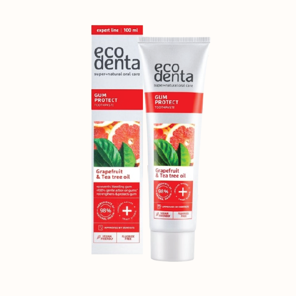 Dentifrice Protection Gencives à l’huile d’arbre à thé. Soin expert pour les gencives sensibles. Développé dans le laboratoire Ecodenta, ce dentifrice agit comme un bouclier qui renforce les gencives et les protège des saignements. Nous avons enrichi le produit en huile d’arbre à thé, reconnue pour ses propriétés antibactériennes, et ajouté un extrait de saule pour aider à prévenir la parodontite. Avec une utilisation régulière, vos gencives deviendront non seulement moins sensibles, mais saigneront également moins souvent, tandis que l’huile essentielle de menthe garantira une haleine fraîche.