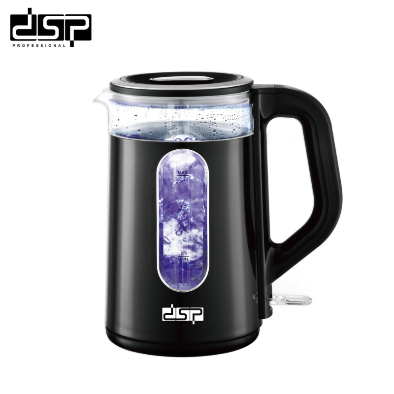Marque : DSP Capacité : 1,7L Puissance : 2200W Tension : 220-240V Base rotative 360° Arrêt automatique Protection à sec Indicateur LED Élément chauffant inox Garantie : 1 an