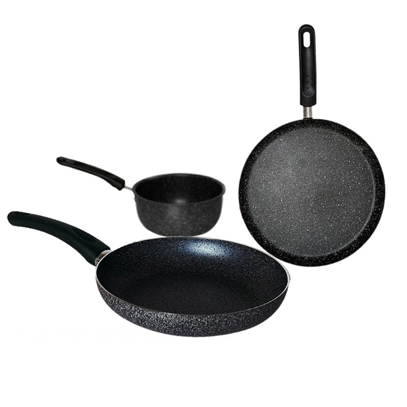 Pack El Gusto By COOK'ART - Poêle : Diamètre: 28 cm + Crêpière : Diamètre: 25 cm + Casserole : Diamètre: 16 cm - Matériau: Granite - Moucheté en blanc - Poignées résistantes à la chaleur - Revêtement anti-adhésif - Cuisson saine - Facile à nettoyer - Durable et léger - Couleur: Noir Livraison Gratuite à partir de 300DT d'Achat
