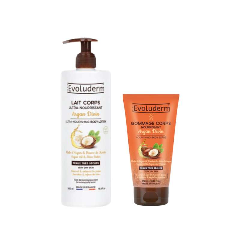 Ce Pack contient : Evoluderm – Gommage Corps Nourrissant Argan Divin 150Ml EVOLUDERM – Lait Corps Nourissant Argan Divin 500Ml
