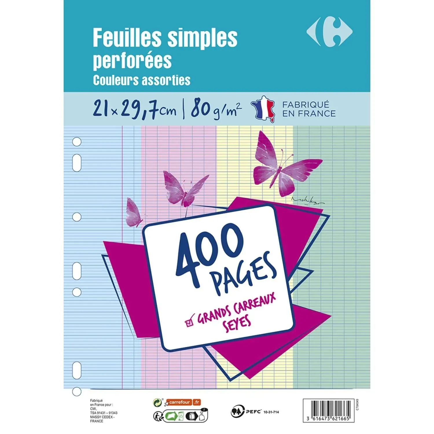 Feuille simple perforée 21x29,7cm Grands carreaux
