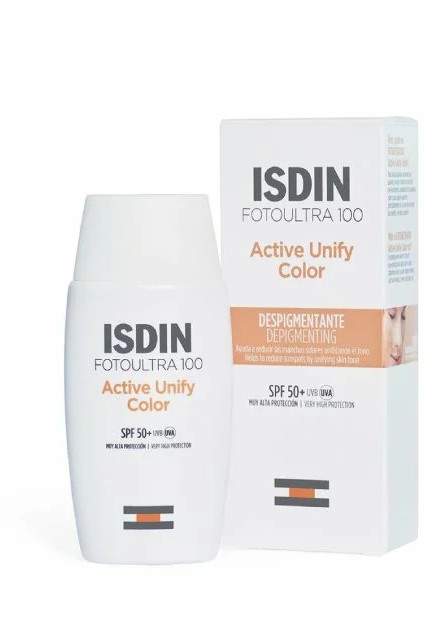 Isdin FotoUltra 100 Active Unify COLOR dépigmentant SPF 50+ ISDIN l’ecran Unify Color permet d’éclaircir et unifier le teint de votre peau. il permet d’Aider à réduire les trouble pigmentaires causés par le soleil et aider à réguler la production de mélanine grâce au DP3-Unify Complex qui agit sur les principales phases de la mélanogenèse et unifier le teint grâce à sa formule teintée. Le fluid ISDIN Active Unify COLOR Offre une protection contre les rayons UVA qui stimulent la pigmentation, 2 fois supérieure au minimum requis dans un protecteur solaire SPF 50+. SPF 106 et UVA 49. Sa texture Fusion Fluid fond sur votre peau. compositions : Aqua (Water), Dibutyl Adipate, Cyclopentasiloxane, Octocrylene, Niacinamide, Alcohol Denat., Titanium Dioxide (Nano), Butyl Methoxydibenzoylmethane, Cyclohexasiloxane, Bis-Ethylhexyloxyphenol Methoxyphenyl Triazine, PEG-30 Dipolyhydroxystearate, Glycerin, Nylon-12, PEG-10 Dimethicone, Sodium Chloride, Phenoxyethanol, Silica, Dimethicone, Phenylethyl Resorcinol, Disteardimonium Hectorite, Panthenol, Tocopheryl Acetate, Allantoin, Glyceryl Stearate, Parfum (Fragrance), Disodium EDTA, Ethylhexylglycerin, Dimethiconol, PEG-8, Sodium Lauroyl Glutamate, Lysine, Tocopherol, Magnesium Chloride, Tetrapeptide-30, Ascorbyl Palmitate, Ascorbic Acid, Citric Acid, CI 77891 (Titanium Dioxide), CI 77492 (Iron Oxides), CI 77491 (Iron Oxides), CI 77499 (Iron Oxides) conseils d’utilisations : Il est recommandé d’Appliquer isdin active unify color fusion fluid le matin et à midi. Renouveler l’application toutes les 2 heures et aussi souvent que nécessaire. Pour un résultat optimal, appliquer pendant une période de minimum 3 mois