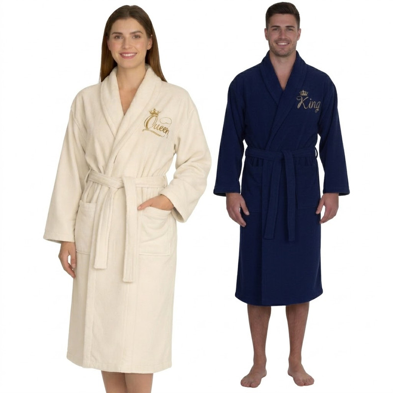 Kenza – Pack Peignoirs 4 Pcs Brodés “King & Queen” 100% Coton – Bleu et Écru – Prix Tunisie dès 3,390 DT | Hawwini
