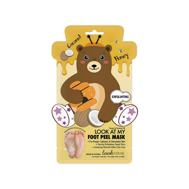 Le masque exfoliant pour les pieds « Look at Me Foot Peel Mask (Bear) » Ă©limine les peaux mortes, sĂšches et calleuses, pour des pieds plus doux. Sa formule utilise un peeling chimique Ă base dâacide lactique, dâacide glycolique et dâacide salicylique.