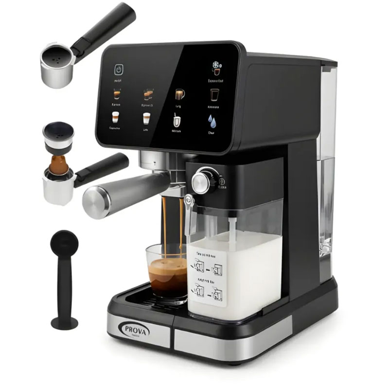 Machine à Café Expresso PROVA - Puissance: 1350 Watts - Pression de la pompe: 20 bars - Capacité: 1.5 Litre - Réservoir à lait 500 ml - Fonctionnalités: Espresso froid, cappuccino, latte, café long, américano, mousse de lait, auto-nettoyage, express - SystÚme de chauffe : Thermoblock - Design moderne - Couleur: Noir - Garantie: 1an Livraison Gratuite à partir de 300DT d'Achat