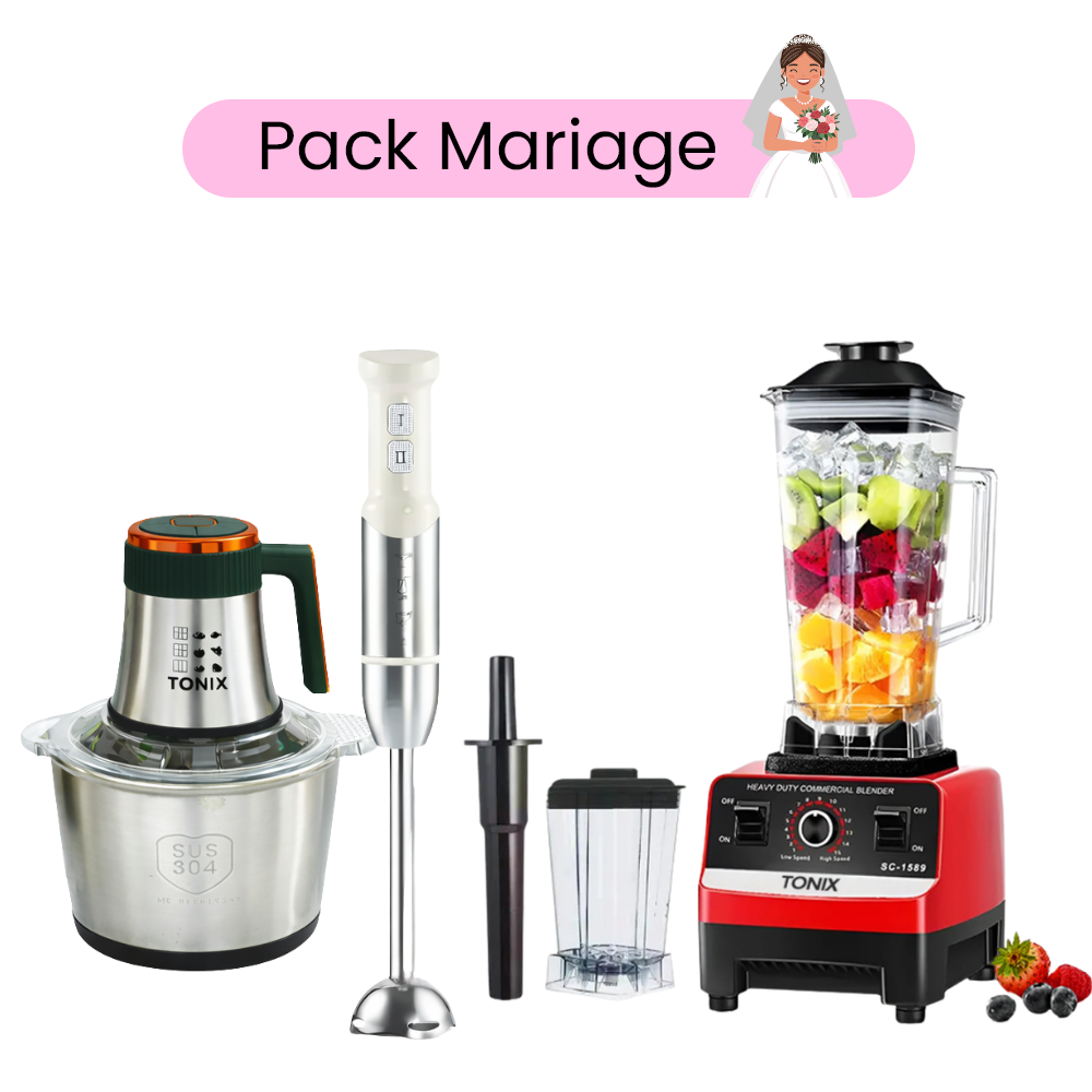 – Pack Confort & Performance 3 en 1 : blender TONIX, hachoir 3L TONIX et mixeur plongeant IRONIX – Puissance élevée : 6500W (blender), 1500W (hachoir), 1800W (mixeur) – Blender multifonction : mixe, broie et prépare smoothies, sauces et soupes – Hachoir grande capacité 3L avec lames en acier inoxydable – Mixeur plongeant en inox : idéal pour mixer, hacher et mélanger rapidement – Utilisation facile et nettoyage rapide – Parfait pour un usage quotidien ou comme pack mariage