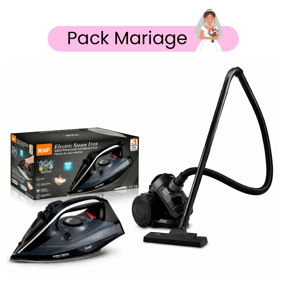 Pack Entretien Maison RAF Aspirateur Sans Sac RAF – Puissance: 800 Watts – Capacité du Réservoir: 2 Litres – Moteur haute performance – Nettoyage multi-surfaces – Facile à utiliser et facile à nettoyer – Conception légère et compacte – Alimentation: 220–240 V, 50/60 Hz – Couleur: Noir Fer a repasser RAF – Puissance: 2200 Watts – Capacité du réservoir d’eau: 400 ml – Semelle en céramique – Vapeur verticale – Contrôle de la température – Alimentation: 220-240 V/ 50hz – Couleur: Noir Garantie: 1an