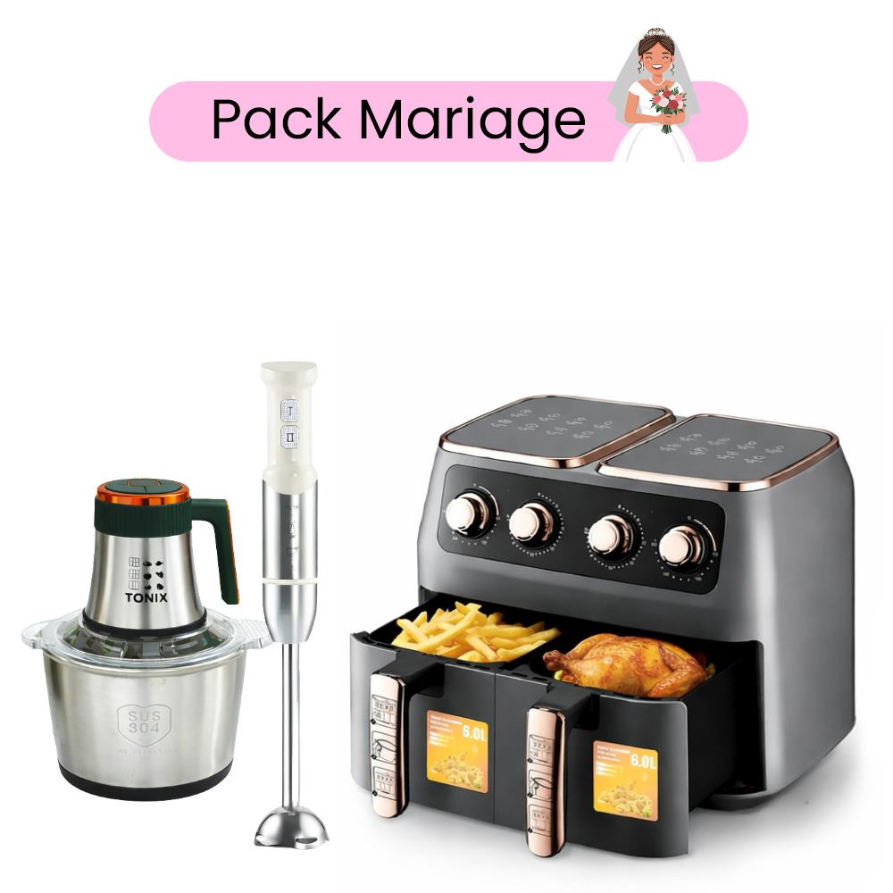 Friteuse Sans Huile : 2800 W, 2 paniers XXL (6 + 6 L), thermostat jusqu’à 200 °C, minuterie 60 min, circulation d’air 360°, revêtement antiadhésif, facile à nettoyer, couleur gris. Mixeur Plongeant : 1800 W, pieds inox, compact et maniable, poignée ergonomique, facile à laver, couleur beige. Hachoir Électrique Tonix : 1500 W, capacité 3 L, lames inox, hache viandes, légumes et fruits secs rapidement, compact et simple à nettoyer. Garantie 1 an