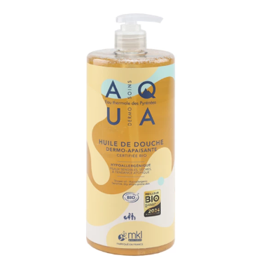 L Huile de Douche Dermo Apaisante Aqua MKL est hypoallergénique et elle est destinée à la peau sensible, sÚche à tendance atopique de toute la famille. Ultra nourrissante, elle apaise la peau sujette à l inconfort, aux tiraillements pour lui apporter douceur et souplesse. Aqua Huile de douche MKL est enrichie en aloe vera bio qui aide à hydrater. Elle contient aussi des huiles végétales qui ont pour rÎle de contrer l effet calcaire présent dans l eau du robinet. Les huiles d Argan et d olivier riches en acides gras assurent une nutrition et une régénération cutanée. Grùce à ces actifs, la peau retrouve son intégrité, son confort et sa vitalité. Huile de douche Aqua MKL : la douceur de l huile d argan pour votre peau Originaire du Maroc, l huile d argan est riche en vitamine E et en insaponifiables. Elle est réputée pour ses vertus nourrissantes, régénérantes et restructurantes. Antioxydante, elle combat les radicaux libres, à l origine d un vieillissement prématuré de la peau. Cette huile lavante bio Aqua MKL élaborée sans savon et sans sulfates et dotée d une base lavante issue de l huile de coco. Elle agit en tant que tensio-actif qui permet de capturer les impuretés et les emporte lors du rinçage à l eau claire, laissant la peau propre et nette. L Huile de Douche Dermo Apaisante Aqua MKL est également formulée à partir d Eau Thermale des Pyrénées aux vertus reminéralisantes, cicatrisantes, antioxydantes et hydratantes. Découvrez également la CrÚme de Douche Dermo Nourrissante Bio MKL Aqua qui apporte un grand confort à la peau. Caractéristiques de l huile de douche Aqua de MKL Green Nature Sans sulfates. Sans savon. pH physiologique. 98% d ingrédients d origine naturelle. Bio. DÚs la naissance.