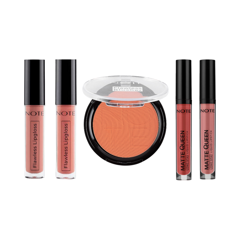 Ce coffret contient : NOTE FLAWLESS BLUSHER 02 NOTE FLAWLESS LIPGLOSS 01 NOTE FLAWLESS LIPGLOSS 02 NOTE MATTE QUEEN LIQUID LIPSTICK N° 09 NOTE MATTE QUEEN LIQUID LIPSTICK N° 06