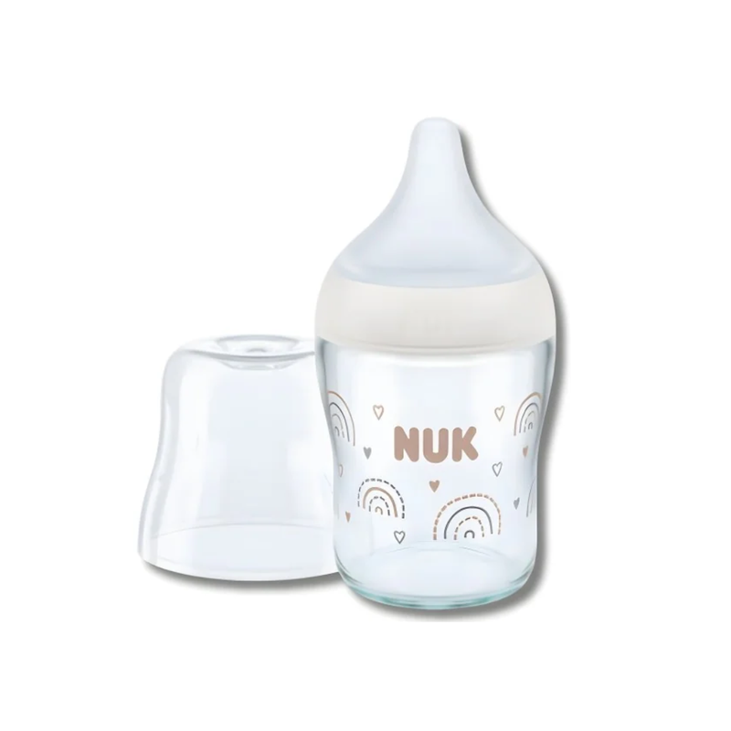 Biberon en verre 120 ml avec tétine douce effet peau, anti-colique, prise en bouche intuitive et indicateur thermosensible pour plus de confort et sécurité.