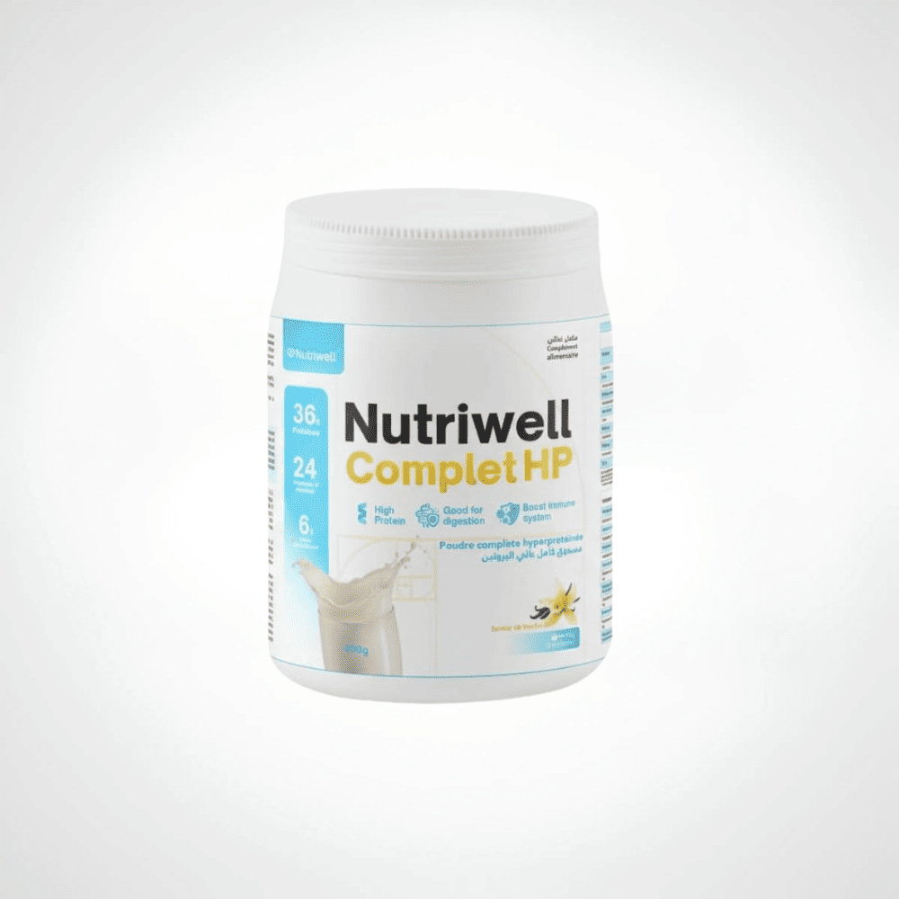 **Nutriwell Complet HP Vanille** en format 400g est une poudre hyperprotéinée complÚte apportant 20g de protéines de haute qualité par portion, enrichie en vitamines, minéraux et énergie. En effet, cette formule médicale tout-en-un combat la dénutrition, préserve la masse musculaire et accélÚre la récupération chez personnes ùgées, patients fragilisés et convalescents. De plus, son délicieux arÎme vanille onctueux, sa dissolution instantanée et sa tolérance digestive parfaite en font le complément nutritionnel oral idéal pour restaurer un statut nutritionnel optimal avec plaisir gustatif.
