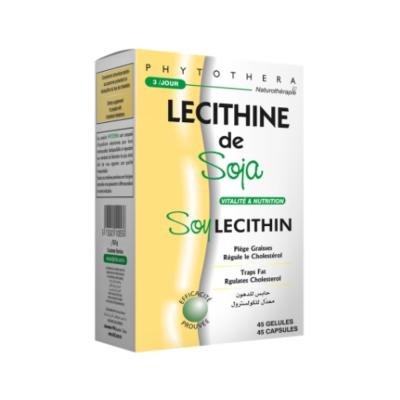 Phytothéra Lécithine de Soja 45 Gélules aide à piéger les graisses, réguler le cholestérol et stimuler la mémoire grâce à la phosphatidylcholine de soja.