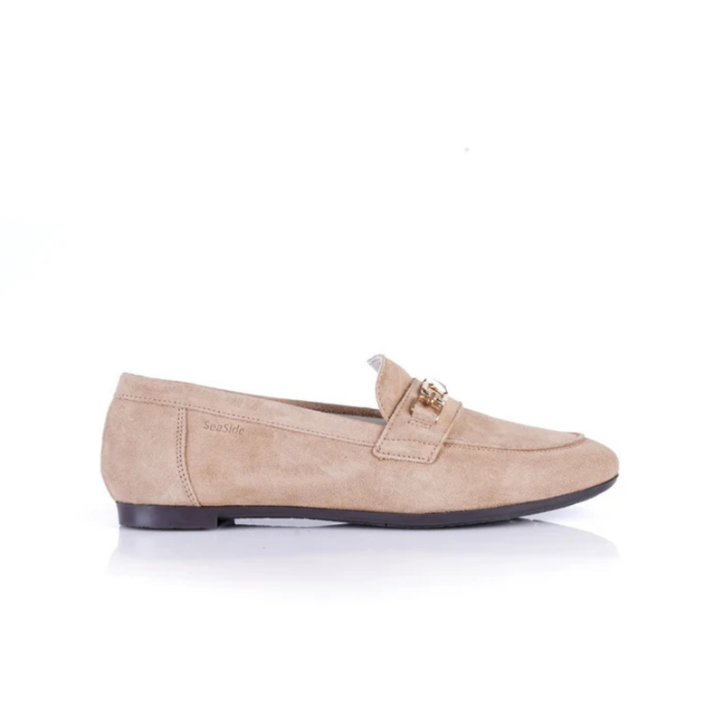 Mocassins femme en daim et cuir véritable, élégants et confortables au quotidien. Disponibles en beige avec détail doré ou noir avec détail argent, ils s’adaptent facilement à tous vos looks.
