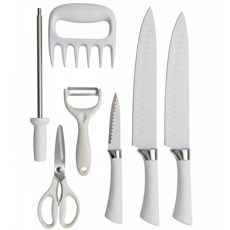Kit De Couteaux - Nombre: 4 Pièces - 3 Couteaux de cuisine + Fourchette à viande + Éplucheur + Ciseau + Aiguiseur + griffes - Matériau Acier inoxydable - Poignée ergonomique Soft Touch assure une prise en main sûre et agréable - Ultra léger, Ultra Sharp et Long Résistance, Durable - Poignées confortables antidérapante - Kit parfait pour tous vos besoins de cuisine - Couleur: Blanc Livraison Gratuite à partir de 300DT d'Achat
