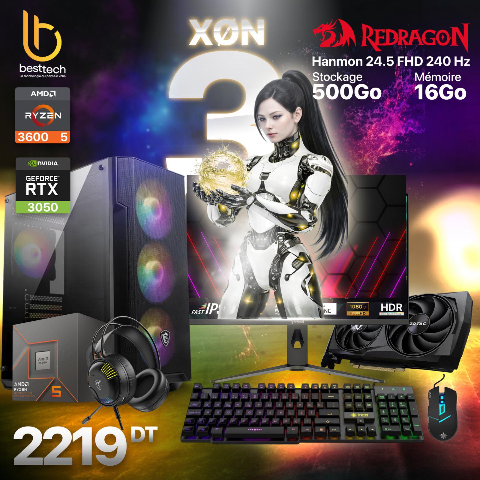 • AMD Ryzen 5 3600 BOX • Carte Mère MSI A520 • 16GB RAM DDR4 • SSD 500GB NVMe • ZOTAC GeForce RTX 3050 8GB • Alimentation MSI 500W • Boîtier MSI M100A RGB 🖥️ Pack Tout Inclus: ✓ Écran REDRAGON Hanmon 24.5” FHD 240Hz ✓ Clavier Gaming INCA 448 RGB ✓ Souris Gaming RGB ✓ Casque Gaming T-DAGGER Alastor T-RGH218 ✓ Tapis XXL Noir 🎮 Performance exceptionnelle ⚡ 240Hz pour une fluidité maximale 🌈 RGB personnalisable 🎯 Idéal pour tous vos jeux