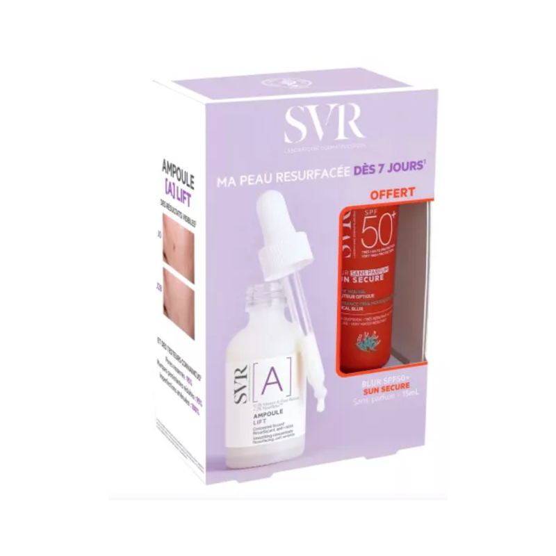 Offrez à votre peau une routine complète avec le coffret contenant l’Ampoule Lift 30ml et le Sun Secure Blur Sans Parfum SPF50+ 15ml offert. L’Ampoule Lift de SVR est un sérum intensif qui lisse et uniformise la peau grâce à sa formule enrichie en 0,3% de rétinol pur et 2% de NovoRetinTM.