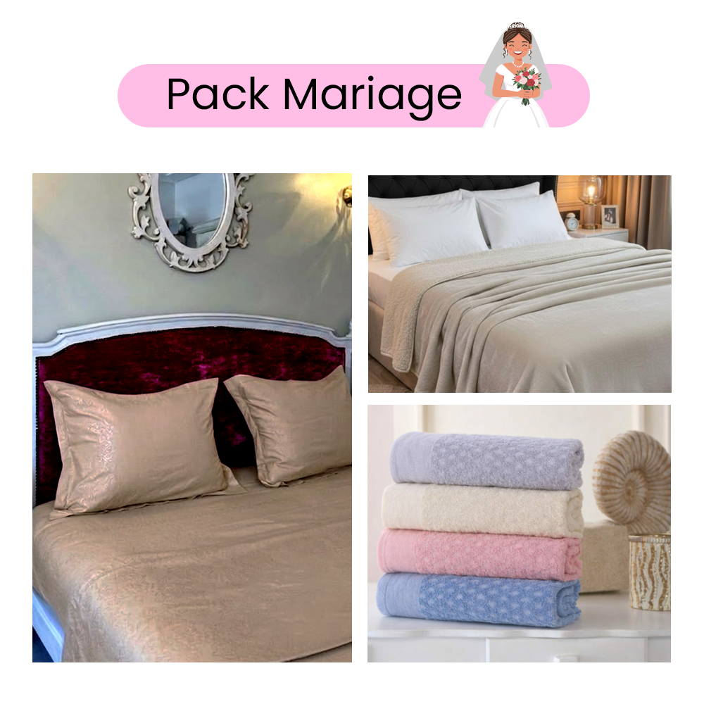 – Pack mariage complet pour chambre & salle de bain – Parure de lit 4 pièces en microfibre douce et confortable – Plaid double face 220×240 cm : velours + texture traditionnelle – Lot de 4 serviettes visage en coton absorbant (90×50 cm) – Confort, élégance et praticité au quotidien – Idéal pour cadeau de mariage