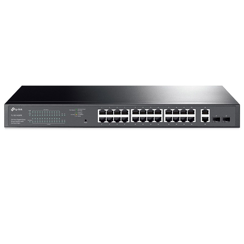 Switch intelligents TP-Link TL-SG1428PE Easy Smart Switch professionnel 28 ports Gigabit avec 24 ports PoE+ Switch PoE polyvalent, facile à utiliser. Scénarios d'application multiples Le TL-SG1428PE est entièrement compatible avec les appareils PoE, tels que les caméras IP, les points d'accès et les téléphones IP. Il fonctionne également avec des périphériques câblés non PoE pour fournir des connexions gigabit, tels que des PC, des imprimantes et IPTV. Surveillance Fonctionne avec les caméras IP Conférence téléphonique Fonctionne avec les téléphones IP Couverture Wi-Fi Fonctionne avec les PAE Omada Connexions filaires Fonctionne avec les PC et les imprimantes 24 ports PoE+ dédiés (budget 250 W) pour de nombreuses applications La conformité à la norme PoE + 802.3af / at prend en charge jusqu'à 30 W sur chaque port PoE. Le budget d'alimentation PoE total de 250 W * pour les ports PoE + 24 × gigabit en fait un large éventail d'applications, telles que la surveillance, les bureaux, les dortoirs et les petites entreprises. Il est entièrement compatible avec les caméras IP, les points d'accès, les téléphones IP, les ordinateurs, les imprimantes, etc. Des fonctionnalités à valeur ajoutée offrent des expériences inattendues QoS pour une expérience sans décalage Assure un trafic fluide pour les applications sensibles à la latence, telles que la voix et la vidéo Surveillance IGMP pour l'optimisation de la multidiffusion Assure une meilleure expérience réseau, en particulier pour les applications comme l'IPTV, en optimisant la distribution du trafic multimédia. VLAN pour la sécurité Aide à créer un réseau avec une sécurité plus élevée et de meilleures performances globales en divisant le réseau en petits groupes.