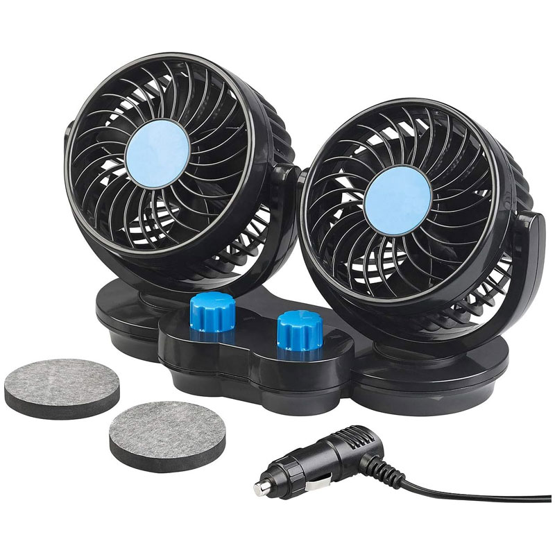 Ventilateur Double de Voiture Pivotant 180° - 2 niveaux pour vitesse du flux - TĂȘtes orientables verticalement et horizontalement - Installation facile par patchs adhĂ©sifs - Pour allume-cigare 12 V dans les voitures particuliĂšres, fourgonnettes, camping-cars, etc. - bouton par ventilateur : Marche/ArrĂȘt - Couleur: Noir Livraison Gratuite Ă partir de 300DT d'Achat